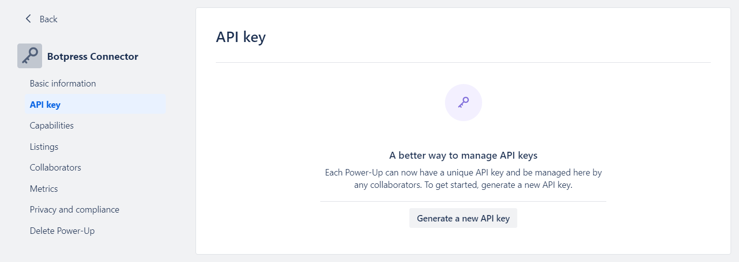 - Once the Power-Up is created, you will be redirected to API Key settings page, displayed below. Generate a new API key, then copy and paste this key into the API Key field in Botpress.